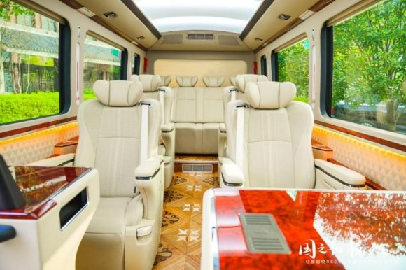 为提供出行途中更好的办公体验,车内更搭载了全新设计的带220V电源的办公桌和折叠助理桌、一键投屏折叠电视、办公位亮度可调阅读灯、冰箱、纳米生态离子织物顶棚等贴心配置。车内饰采用环保材质,禁用物质十项达标率100%,独立循环的过滤PM2.5和空气净化功能,全程呵护乘客出行安全健康。